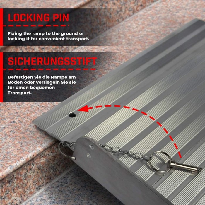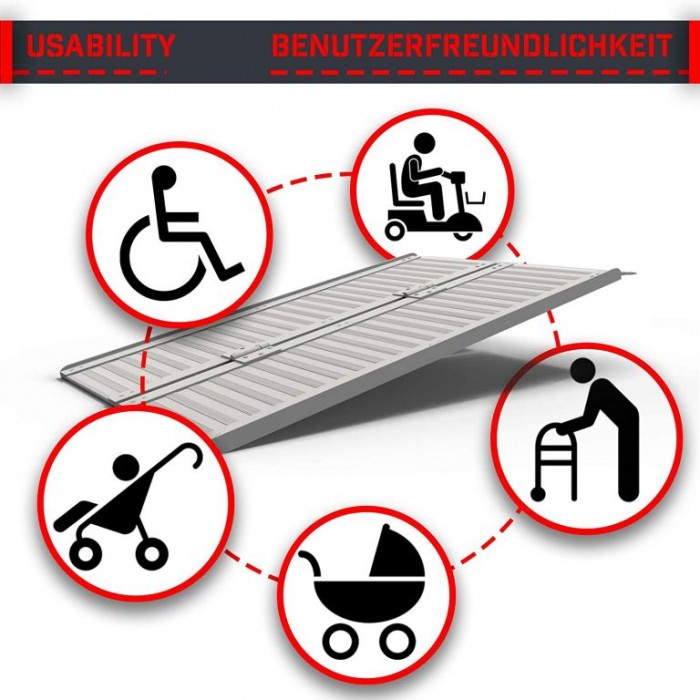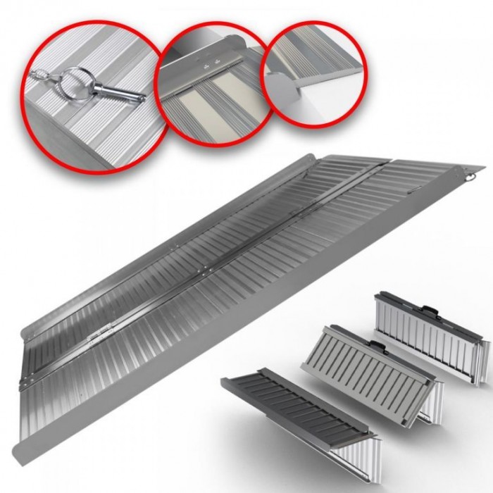 Díky lehké a odolné hliníkové konstrukci je rampa snadno přenosná a zároveň dostatečně pevná pro použití s různými vozíky a pomůckami. Protiskluzový povrch a boční zábrany zajišťují maximální bezpečnost při používání. Rampa je skládací, což usnadňuje její skladování a přepravu.
