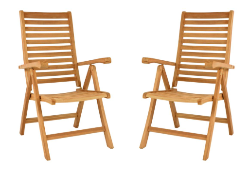 Židle jsou vyrobeny z masivního teakového dřeva s pevnými kovovými panty, opěrku lze nastavit do 5 poloh. Díky skládacímu mechanismu ušetří místo, přesto poskytují stabilní a pohodlné sezení. Rozměry cca 110 × 56 × 75 cm a hmotnost 10 kg na kus dokazují odolnost a dlouhou životnost pro venkovní použití.