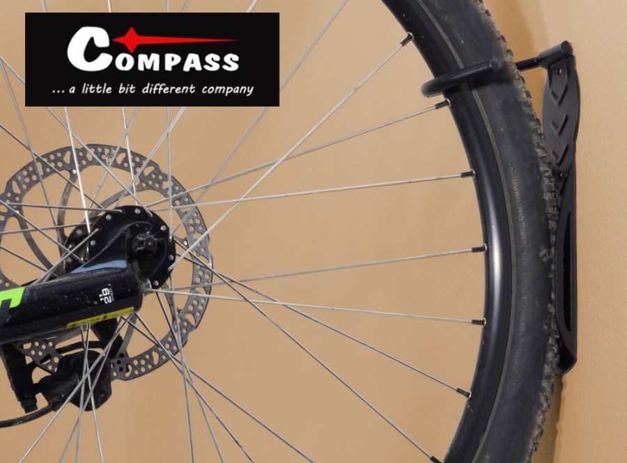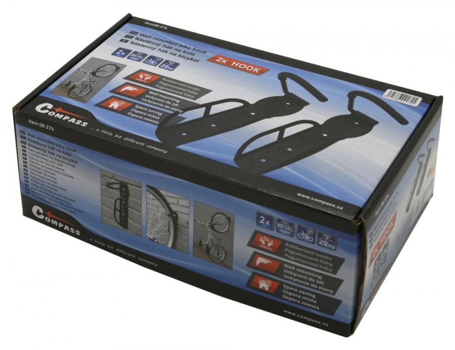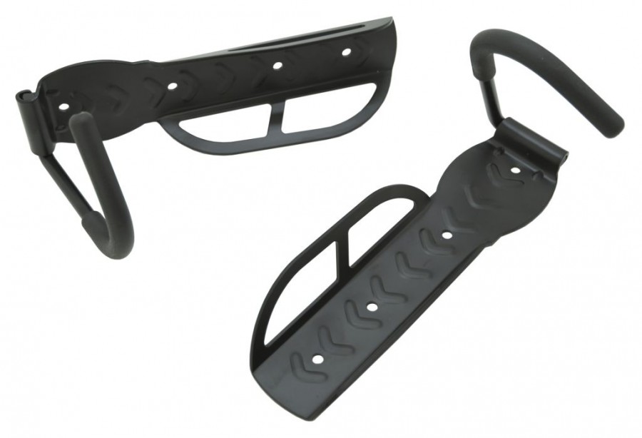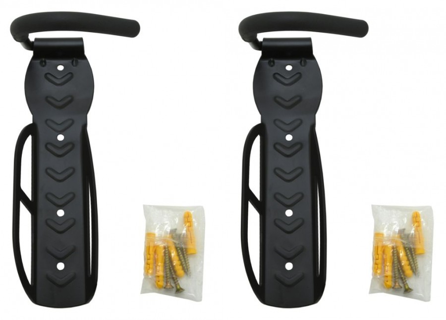Sada 2x celokovových držáků jízdních kol určených k montáži na stěnu. Držáky jsou vybaveny hákem pro zavěšení předního kola a vodící deskou, díky které kolo neznečistí zeď a zároveň zabraňuje výraznému naklánění kola do stran. Díky zavěšení kol do držáků snadno ušetříte místo. Montáž držáků se provádí do zdi, pomocí vrutů s hmoždinkami. Konstrukce držáku je celokovová s pogumovaným hákem.