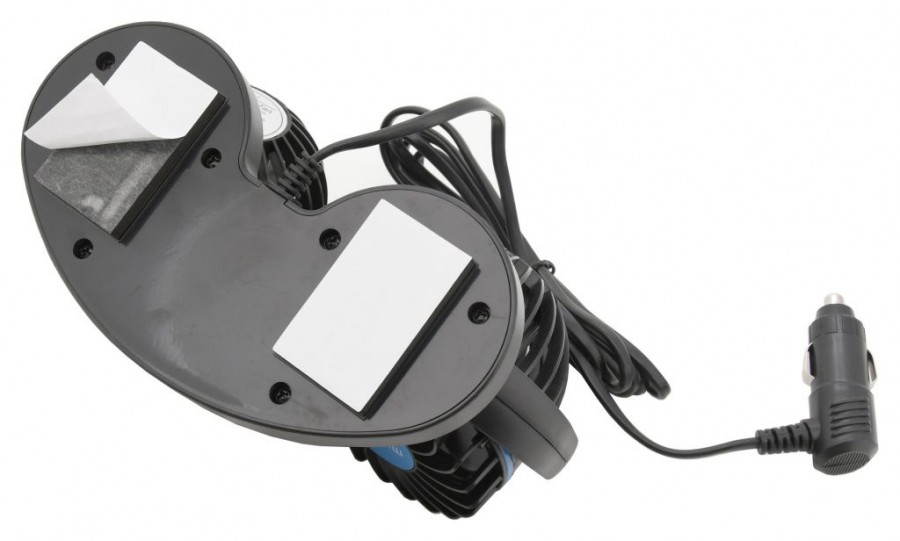 Ventilátory lze plynule regulovat pomocí regulátoru vrchní strany držáku. Napájení 12 V ze zásuvky autozapalovače. Oba ventilátory průměru 8,5 cm lze nezávisle na sobě natočit libovolným směrem. Sestava ventilátorů se upevňuje pomocí přiložených dvou kusů lepících destiček, které zajišťují precizní a silné uchycení. Ventilátory vynikají tichým chodem a velmi nízkou spotřebou proudu.