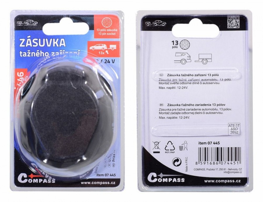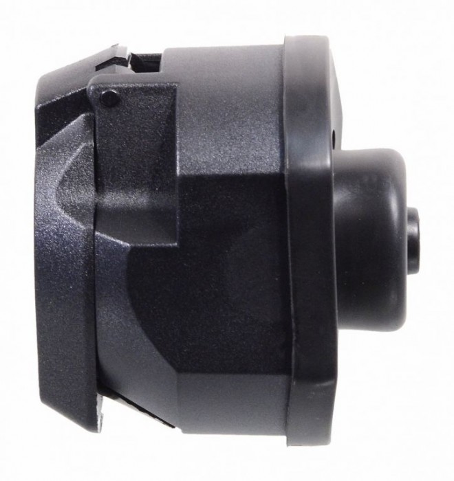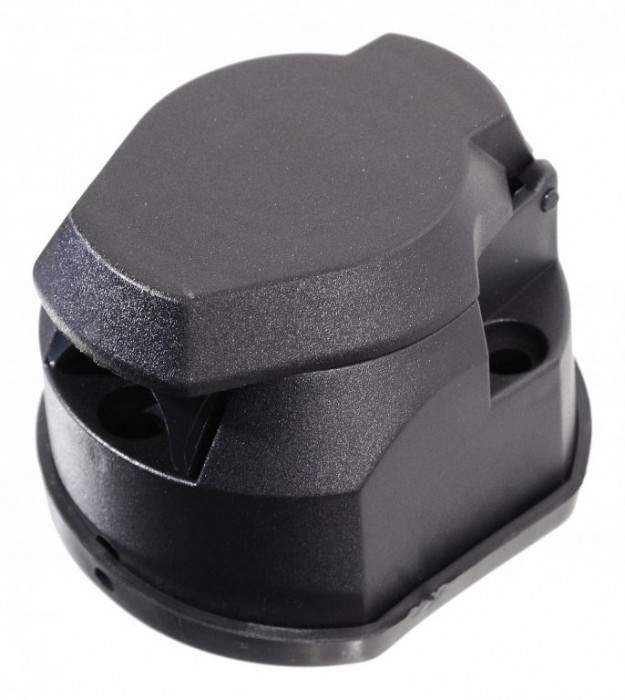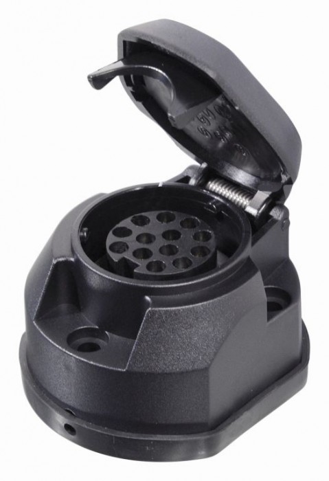 Zásuvka pro tažné zařízení automobilu dle normy DIN 11446, 13 pólů. Zásuvka je vybavena těsněním a krytem, který se automaticky (pružinou) uzavírá.