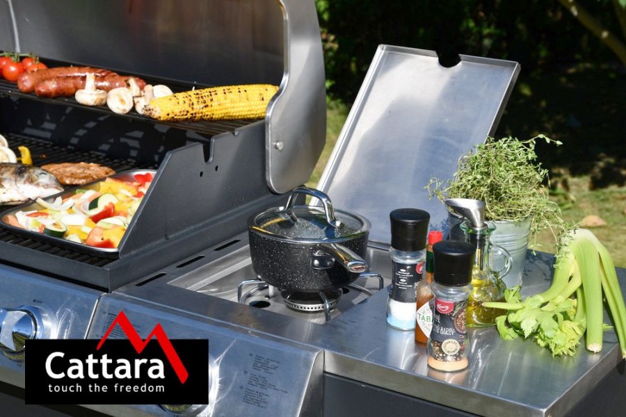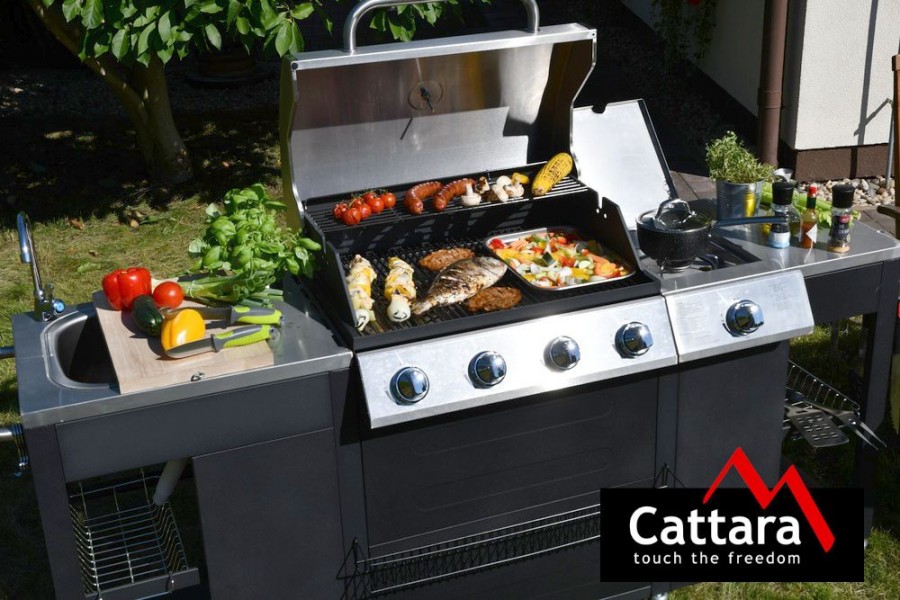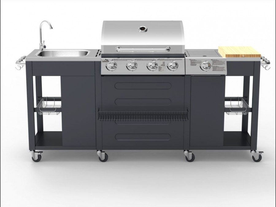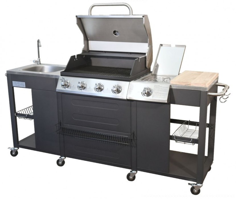 Zahradní kuchyně VICENZA nabízí vše potřebné pro zahradní grilování s přáteli. Je jedinečnou kombinací plynového grilu, dřezu s vodovodním kohoutkem, pracovní desky s masivním dřevěným prkénkem, plynového hořáku (vařiče) a odkládacích košů. Hlavní grilovací prostor je osazen 4x hořáky se samostatnou regulací a piezo zapalováním. Díky možnosti vypnout prostřední hořáky je gril vhodný jak pro přímé, tak pro nepřímé grilování, je vybaven teploměrem a odkládacím roštem pro udržování teplot již hotových pokrmů. Celá zahradní kuchyně je doplněna vařičem se samostatnou regulací a piezo zapalováním. Součástí je i spojovací hadice k plynové lahvi a redukční ventil. Systém Flame Tamer – přímo nad hořáky jsou umístěny kovové profily, které zabraňují skapávání tuku mezi plameny a jeho následné vzplanutí. Zároveň zabraňují přímému ohřevu mřížky plameny hořáku pouze v jeho místě, čímž dochází k výrazně rovnoměrnějšímu vyhřívání celé grilovací mřížky se smaltovanou povrchovou úpravou. Grill je opatřen poličkou ve spodní části celé plochy grilu, určenou pro odkapávající tuk. Polička se vysouvá v zadní časti, tím je docíleno snadného čištění grilu. Dřez spolu s vodovodním kohoutkem je výborným pomocníkem při grilování. Kohoutek lze snadno připojit např. na vodovodní hadici. Celá zahradní kuchyně je pojízdná (8 koleček z toho 4 bržděná), po stranách i zepředu je osazena odkládacími košíky a na bočních rukojetích i háčky pro zavěšení.