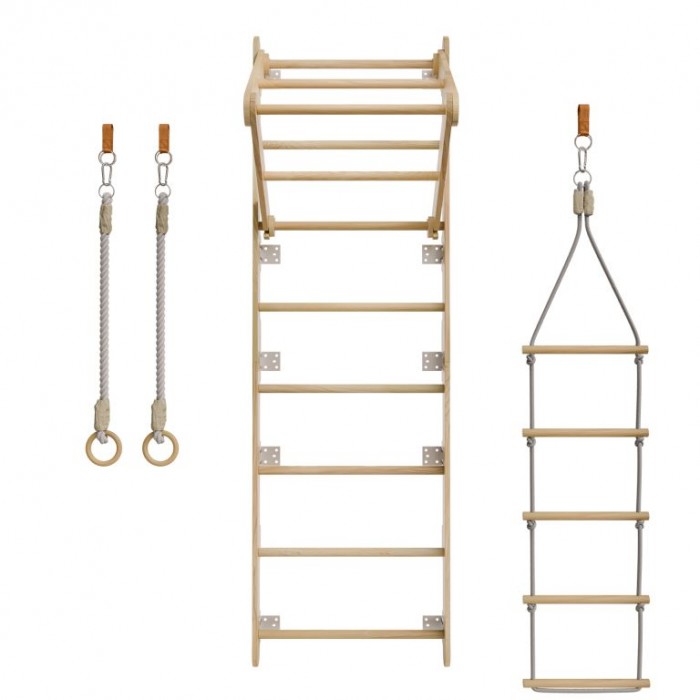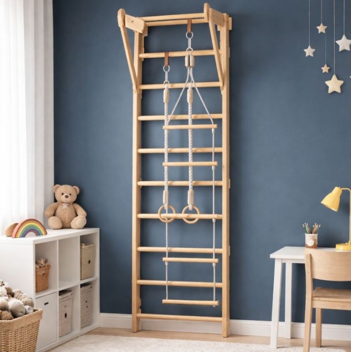 Vneste do dětského pokoje více pohybu a radosti. Dřevěné žebřiny s bohatým příslušenstvím poskytnou dětem prostor, kde mohou rozvíjet své schopnosti, posilovat tělo a užívat si aktivní zábavu každý den. S gymnastickými kruhy, hrazdou a lanovým žebříkem se obyčejné hraní promění v dobrodružství plné lezení a objevování.