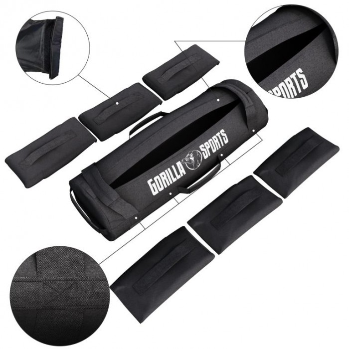 Nastavitelný fitness zátěžový pytel od Gorilla Sports. Díky inovativnímu designu můžete zátěžové vaky vyjmout jednotlivě a přizpůsobit tak své tréninky individuálně své kondici. Každý pytel naplněný pískem. Otevírání zátěžových vaků je několikrát přehnuté a je opatřeno kvalitním suchým zipem, který chrání písek před stékáním. Pytel s pískem má šest polstrovaných rukojetí pro pohodlné a bezpečné cvičení, kvalitní nylonovou výztuhu s dvojitým prošíváním pro větší odolnost a praktický zip, který umožňuje kdykoli přidat nebo odebrat zátěž.
