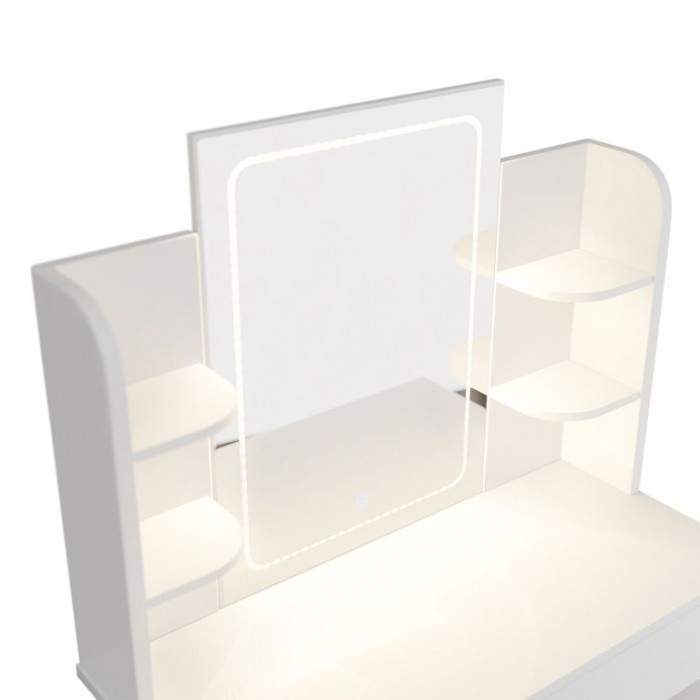 Popis: Bílý toaletní stolek Zoey s LED zrcadlem a úložnými policemi