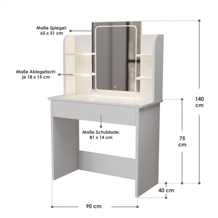 Vneste do svého domova eleganci a pořádek s toaletním stolkem Zoey. LED zrcadlo vám poskytne ideální světlo pro líčení a úpravu vlasů, zatímco šest polic zajistí dostatek prostoru pro všechny vaše poklady. Užijte si chvíle péče o sebe v pohodlí domova.