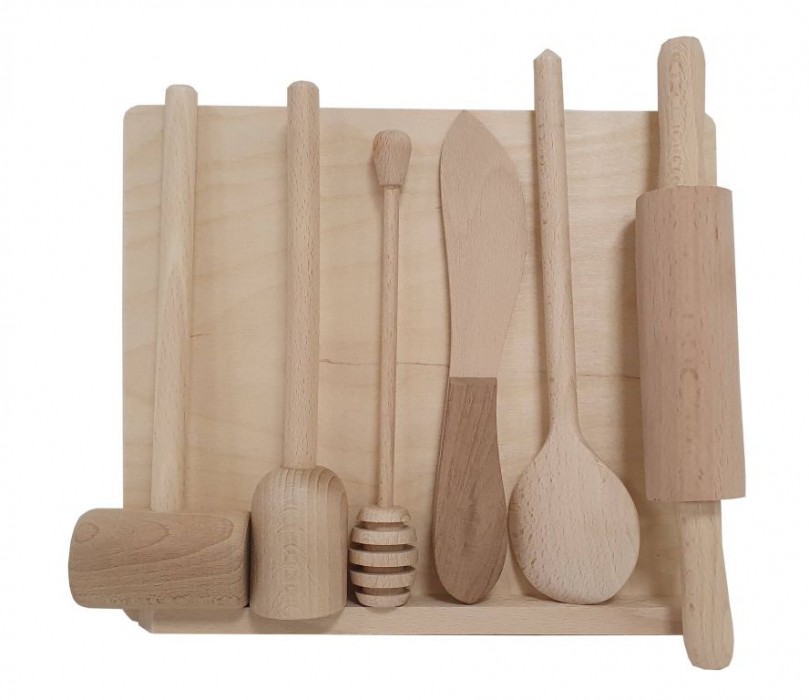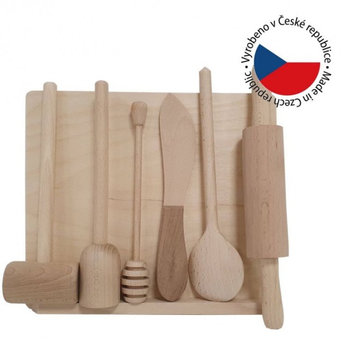 Dřevěná sada je vyrobená z bukového přírodního dřeva a skládá se z taburetu a ze šesti dalších kuchyňských potřeb.