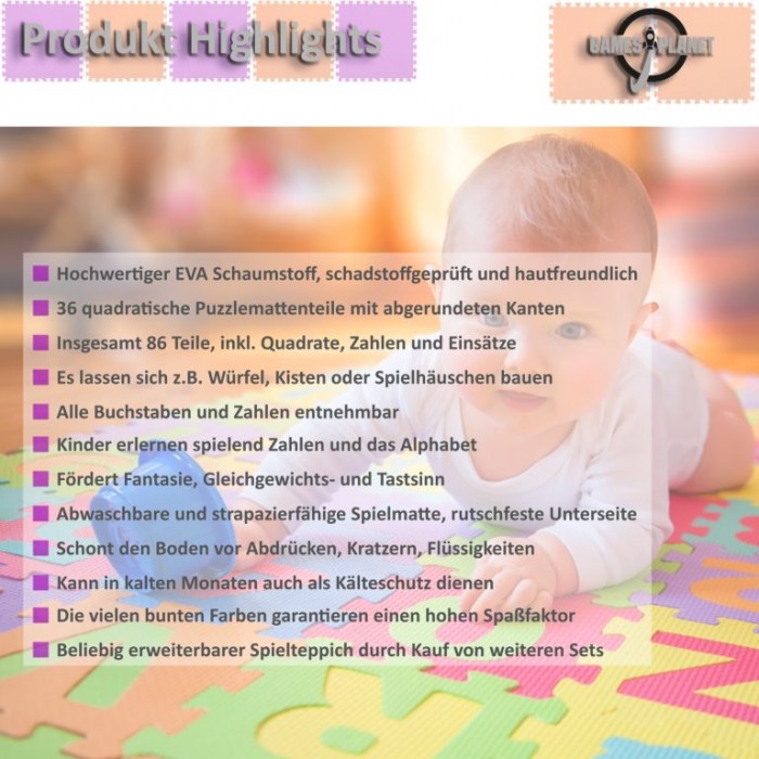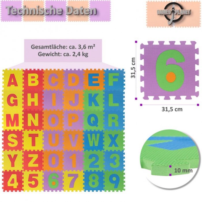 Tato podložka nabízí nekonečné možnosti hraní, jako je stavění kostek, krabic, domečků, inspiraci se meze nekladou. Zábavně se s dětmi můžete také učit čísla a abecedu. Slouží také jako ochranna podlahy, skvěle se hodí na místa bez koberců. Podložka je omyvatelná vodou, odolná, protiskluzová, chrání podlahu před stopami, poškrábáním, tekutinami a je vhodná i jako ochrana proti chladu v chladných měsících. Sada se skládá z 36 čtvercových dílků puzzle, 26 písmen od "A-Z" a 10 číseln od "0-9", celkem 86 dílků.