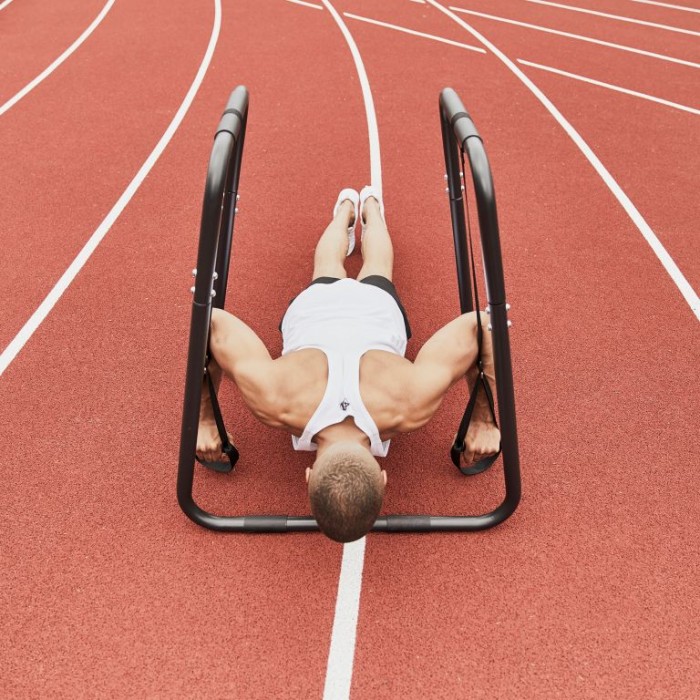 V této stanici je výzvou dělat kliky. Díky jeho poměrně nízké hmotnosti si tento fitness přístroj můžete vzít s sebou i ven na trénink. Samozřejmě se můžete svobodně rozhodnout, zda chcete pracovat na základě rukojetí nebo s ocelovým rámem. Podle toho, jakou variantu zvolíte, oslovíte jinou svalovou skupinu. S maximální nosností 150 kilogramů a délkově nastavitelnými rukojeťmi se toto tréninkové zařízení jistě stane novým standardem ve vaší domácí posilovně. Nabízí Vám praktickou šanci zacílit na oblast paží nebo horní části těla různými způsoby a zároveň je dostatečně prostorově nenáročný na to, aby byl integrován do domácích posiloven s o něco menší plochou.