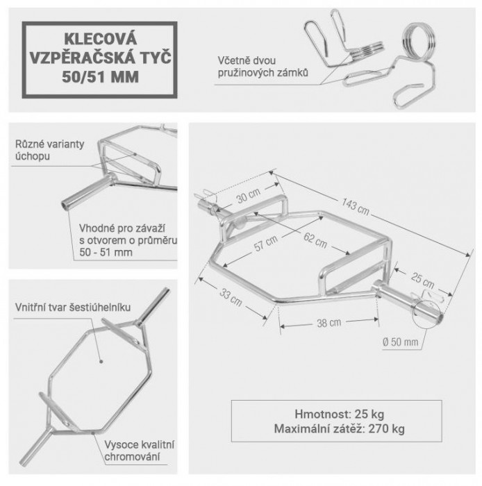 Obouruční tyč, která byla speciálně vyvinuta pro vysoké zatížení při vzpíraní, mrtvém tahu či dřepech. Díky chromované oceli se tyč jednoduše udržuje a je odolná vůči korozi.