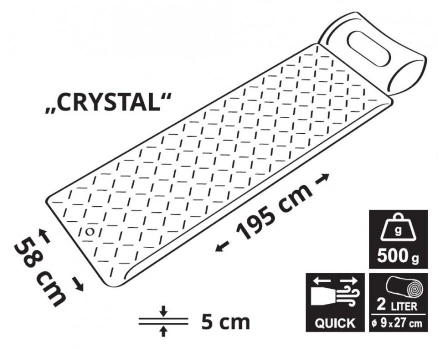 Karimatky jsou neodmyslitelnou součástí pro stanování, camping a outdoor. Mají ty nejlepší izolační a komfortní vlastnosti. Karimatka Crystal je nafukovací a díky svému tvarování nabízí velmi komfortní použití. Balení má velice drobné rozměry a váhu, není tedy problém jej mít vždy po ruce, jako příruční zavazadlo do přírody. Karimatka je navíc vybavena polštářem, zajišťujícím pohodlí v jakýchkoliv podmínkách.