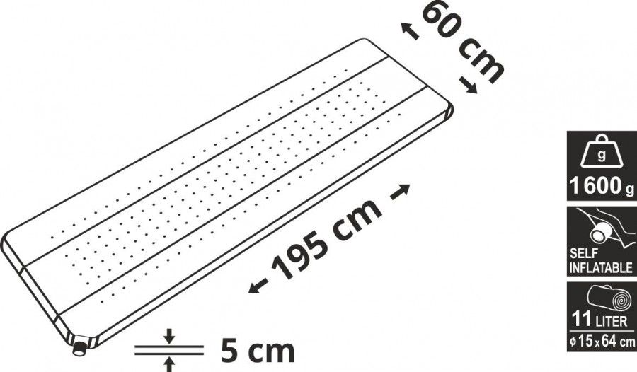 Samonafukovací karimatka má vysokoporézní pěnové jádro zalaminované do nepropustné tkaniny. Tento pěnový materiál do sebe po otevření ventilu nasává vzduch a rychle expanduje, čímž získává svůj typický tvar. Při skládání samonafukovací karimatky se nejdříve uvolní ventil a tlakem se vzduch vyhání ven. Díky tomu má mnohem menší rozměry v balení, oproti běžným pěnovým karimatkám. Barva karimatky je modrá s šedým pruhem. Díky délce 195 cm a šířce 60 cm je karimatka ideální i pro větší osoby. Tlouštka 6 cm navíc zaručuje vysoký komfort, při použití. Balení má drobné rozměry 64 x 15 cm a váhu 1600 g, není tedy problém mít ho vždy u sebe jako příruční zavazadlo v přírodě.