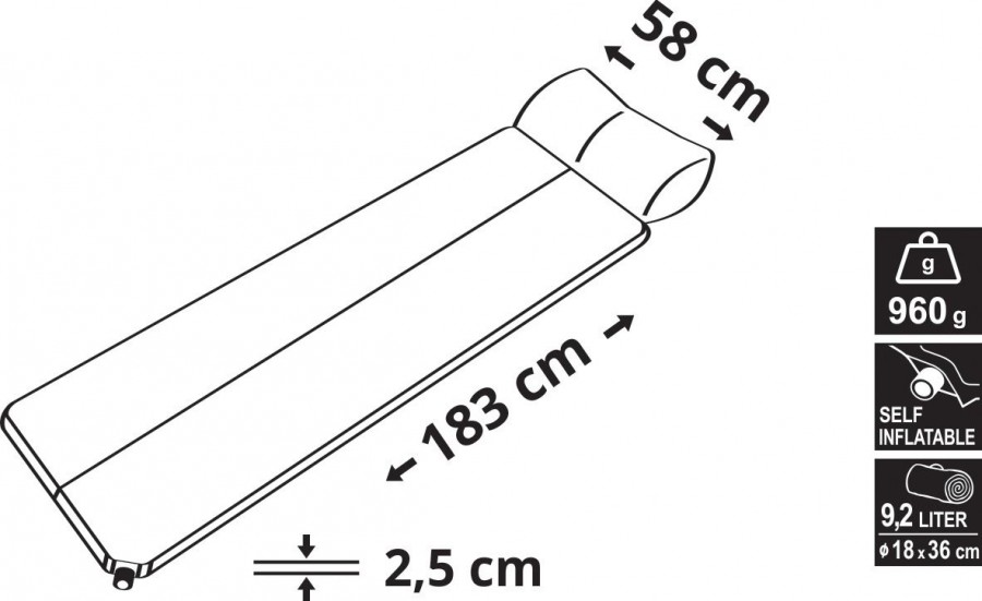 Popis: Karimatka samonafukovací s polštářem, 183 x 58 x 2,5 cm