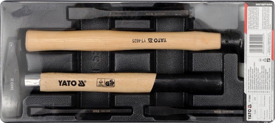 Sada 5 kusů kladiv a dlát z CrV oceli. Sada je přehledně srovnána ve vložce do zásuvky z PVC.