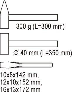 - dláta: 10 x 8 x 142, 12 x 10 x 152, 16 x 13 x 172 mm