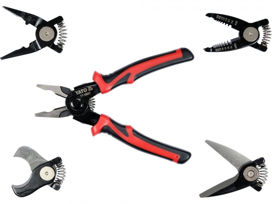 Pro řezání kabelů (rozsah řezání: 16 mm, materiál: uhlíková ocel), univerzální (rozsah řezání ocelového drátu: 3 mm, materiál: CrV60), pro řezání plechu (rozsah řezání ocelový plech 0,5 mm, nerez 0,3 mm, plasty 1,5 mm, materiál: 4Cr13), pro odizolování (rozsah: AWG 22-10, 0,6-2,6 mm, materiál: uhlíková ocel), pro krimpování konců drátů (rozsah: AWG 22-10, 1,5-6,0 mm), materiál: uhlíková ocel)