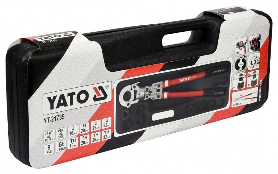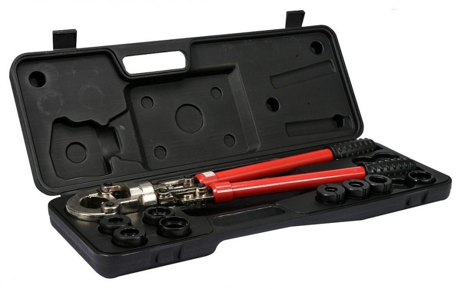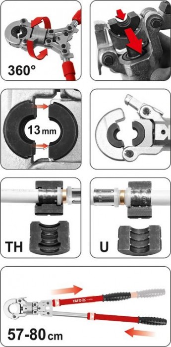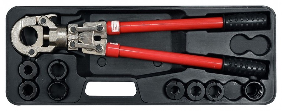 Lisovací kleště na plastové vodovodní potrubí PEX-AL-PEX, PERT-AL-PERT se sadou 8 výměnných čelistí U a TH. Spojování lisováním je mnohem rychlejší než pomocí tradiční techniky (pájení, svařování, lepení) a vede ke snížení nákladů na instalaci. Kleště jsou vybaveny hydraulickým pohonem, který umožňuje lisování silou až 60 kN. Otočná hlava umožňuje práci v těžko přístupných místech. Rukojeti kleští jsou teleskopické, lze je prodloužit z 57 cm až do 80 cm a tím vytvořit ještě větší páku pro důkladné spojení.