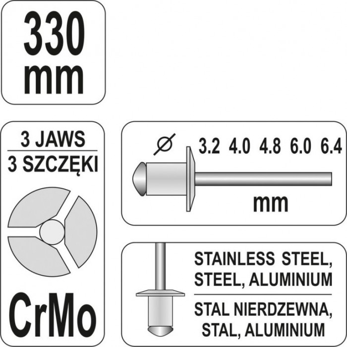 - rozměr nýtů: 3,2; 4; 4,8; 6; 6,4 mm