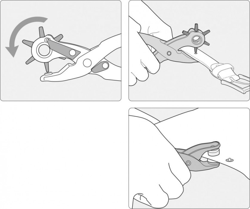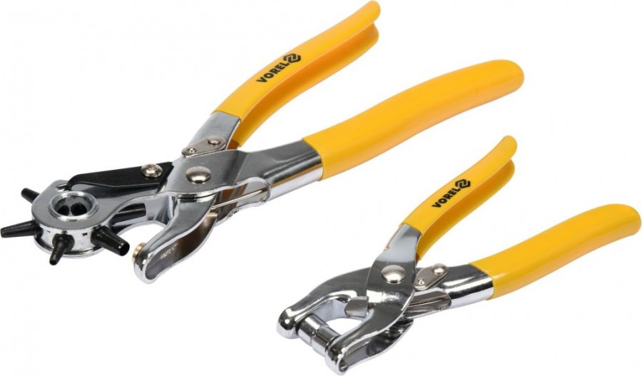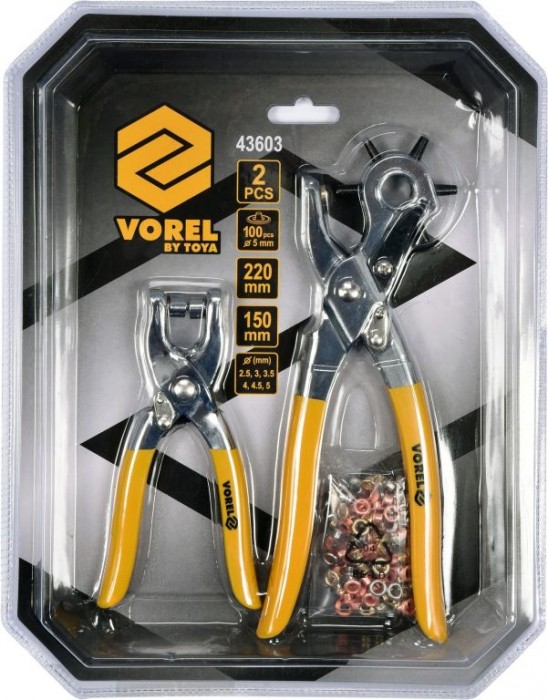 Sada precizních děrovacích kleští z kvalitní uhlíkové oceli s tvrzenými hroty. Vhodné pro děrování otvorů o průměrech od 2,5 do 5 mm. Kleště jsou opatřeny ráčnovým mechanizmem a jsou vhodné děrování do materiálů jako je kůže, koženka, pryž, lepenka a podobné materiály. Balení je složeno z nastavitelných kleští délky 220 mm, kleští 150 mm a 100 ks oček.