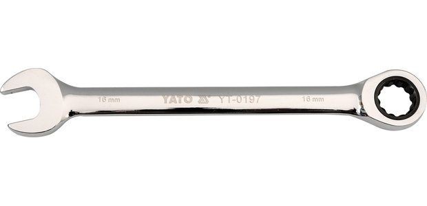 Ráčnový očkoplochý klíč Yato - na jedné straně klasický stranový klíč, na straně druhé očkový klíč s dvanáctihranným profilem vybaveným ráčnou s jemným dělením 72 zubů. Tělo klíče je vyrobeno z chromvanadiové oceli CrV6140. Povrch je vyleštěn do vysokého lesku.