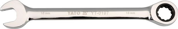Ráčnový očkoplochý klíč Yato - na jedné straně klasický stranový klíč, na straně druhé očkový klíč s dvanáctihranným profilem vybaveným ráčnou s jemným dělením zubů. Tělo klíče je vyrobeno z chromvanadiové oceli. Povrch je vyleštěn do vysokého lesku. Klíč je vybaven systémem AS-Drive - vnitřní profil je tvarován do mírného obloučku. Tím při záběru hlavní síla nepůsobí přímo na hranu šroubu, ale na plochu, což významným způsobem snižuje opotřebení šroubu a pomáhá při demontáži již poškozených šroubů.