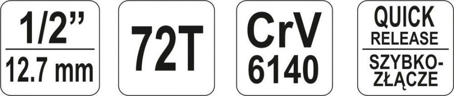 Kvalitní vyhnutá ráčna s pohodlnou plastovou rukojetí. Ráčna je opatřena přepínací páčkou a jemným chodem zajištěným 72 zubým mechanismem. Zhotovení 1/2" ráčny z kvalitní Chromvanadiové slitiny oceli CrV6140 délky 255 mm.