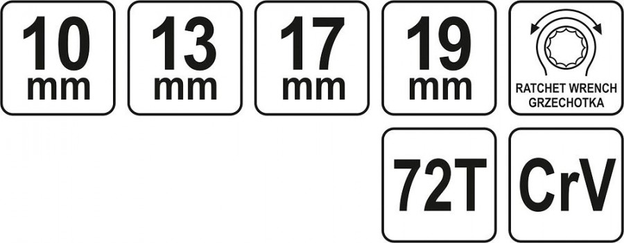Ráčnový, oboustranný, průchozí klíč s ráčnami 10 x 13 mm a 17 x 19 mm. Klíč byl vyvinut tak, aby vyhovoval potřebám specializovaných automobilových a jiných mechanických dílen. Zhotovení klíče z kvalitní chromvanadiové slitiny oceli CrV zajišťuje dlouhou životnost a korozivzdornost.