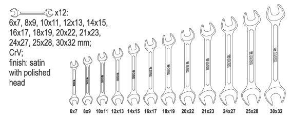 Sada 12 kusů stranových klíčů je vyrobena z kvalitní chrom vanadiové slitiny oceli. Klíče jsou uložených v odolném pouzdře ze silné syntetické tkaniny, umožňující zavěšení.