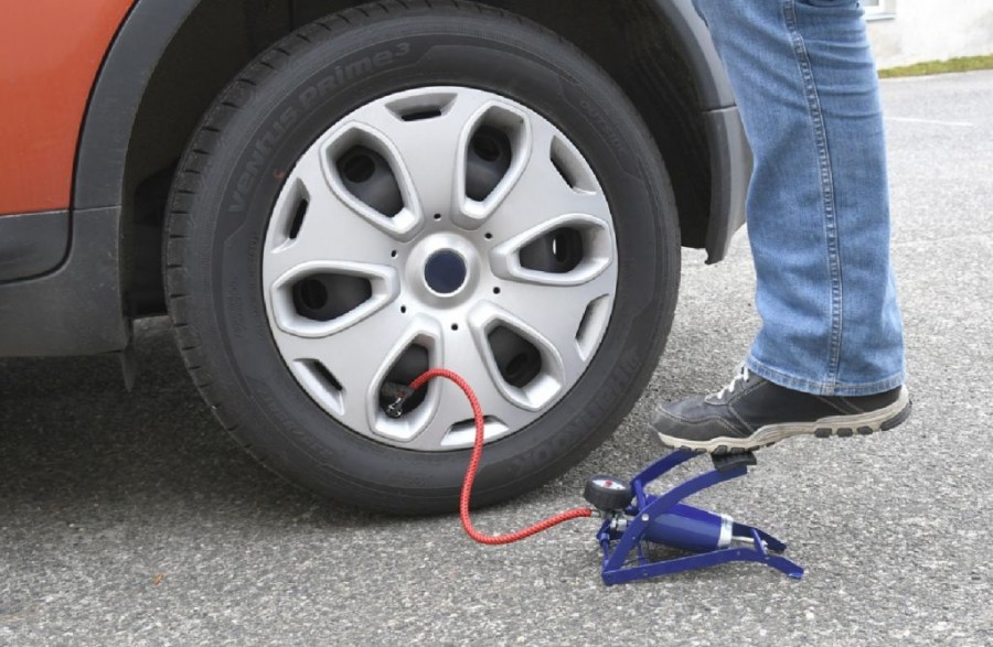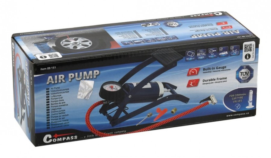 Nožní pumpička - hustilka se dvěma písty a s manometrem, pro huštění pneumatik osobních automobilů. Součástí balení jsou adaptéry pro různé použití.