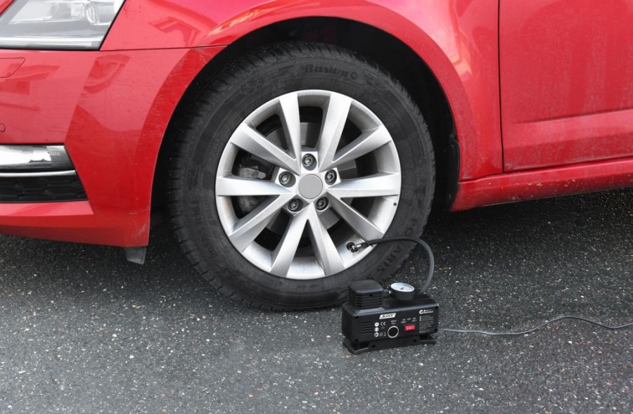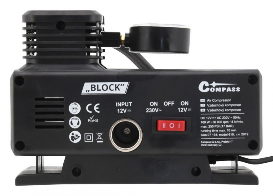 Vzduchový kompresor s vysokou účiností a napájením 12 V / 230 V. Napájecí kabely i hustící hadice mají dostatečnou délku 12 V - 260 cm / 230 V - 150 cm a hadice 0,5 m. Komprosor je vybavený vestavěným pneuměřičem, který zobrazuje naměřený tlak v několika jednotkách.