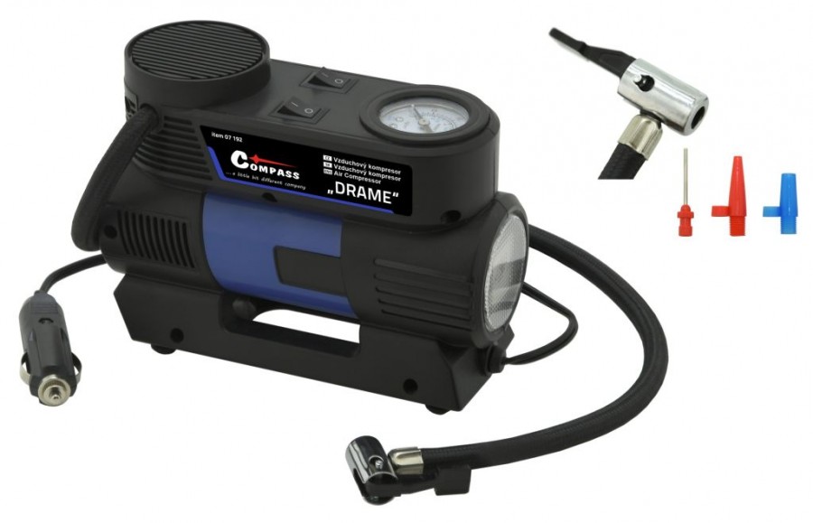 Vysoce výkonný kompresor s vestavěným pneuměřičem a napájením 12V ze zástrčky automobilového zapalovače.