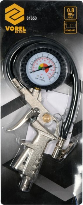Pistole na hustění pneu s manometrem je skvělým doplňkem pro autodoplňky a autopříslušenství. Pistole dokáže určit tlak od 2,8 bar až do 10 bar.
