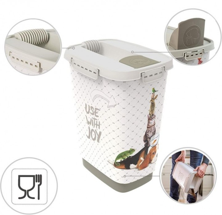 Vyklápěcí dávkovač ve víku, pro jednoduché dávkování a odsypávání krmiva. Spolehlivé vzduchotěsné uzavření víka díky bočním klipsům. Ergonomický tvar umožňuje pohodlné uchopení. Vyrobeno z plastu vhodného pro potraviny (PP).