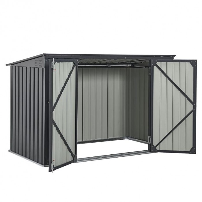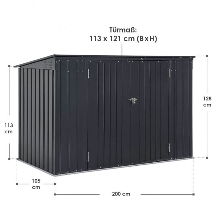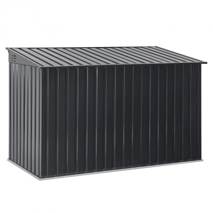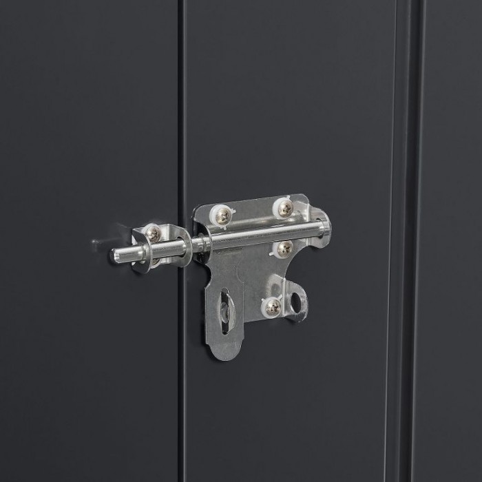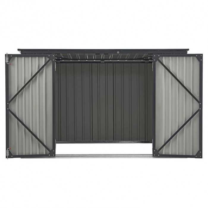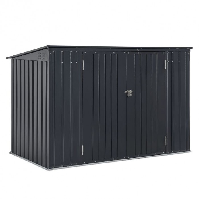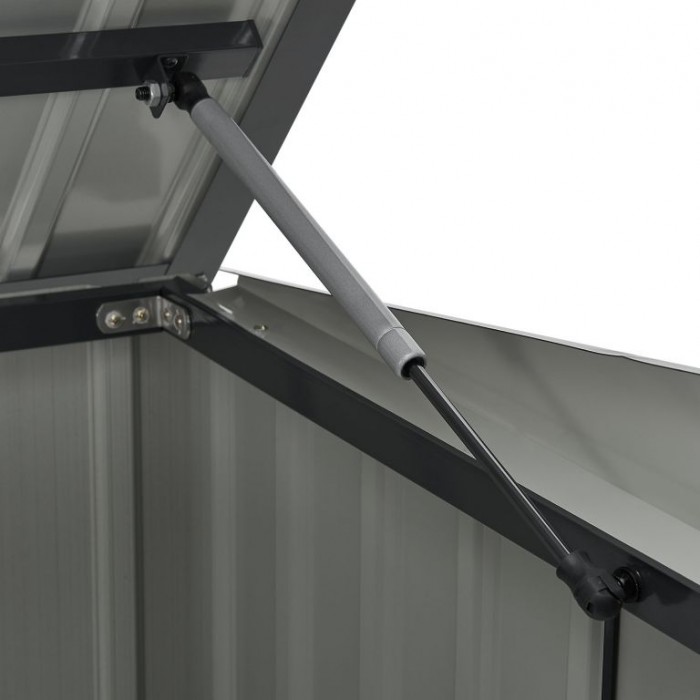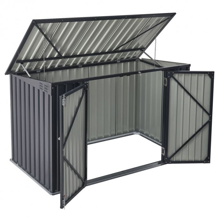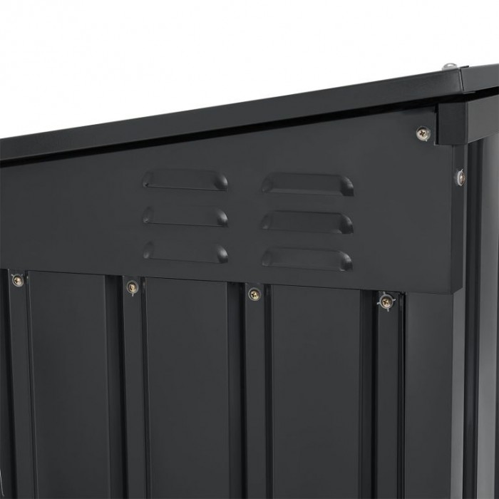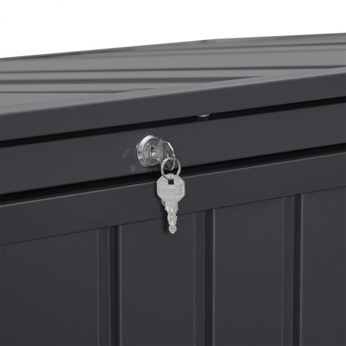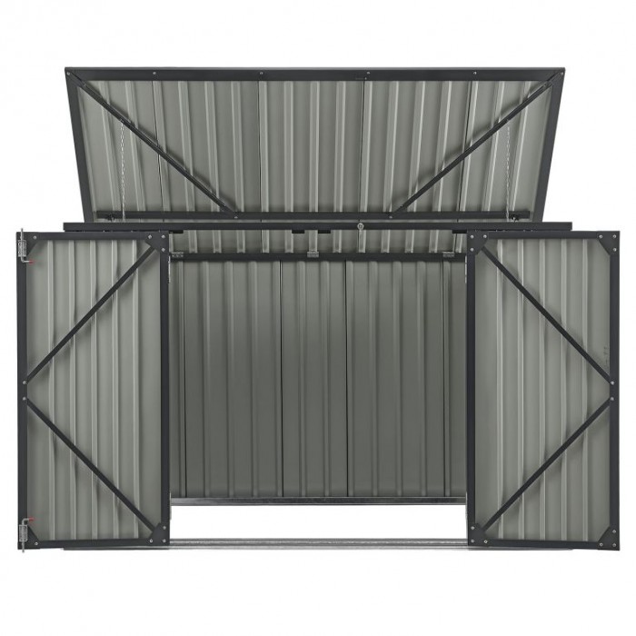 Konstrukce z pozinkovaného kovu odolává dešti, slunci i mrazu a boční větrací otvory pomáhají předcházet vlhkosti a nepříjemnému zápachu. Box lze využít také pro uskladnění kol, nářadí nebo zahradního vybavení. S neutrálním designem skvěle zapadne do jakéhokoli exteriéru.