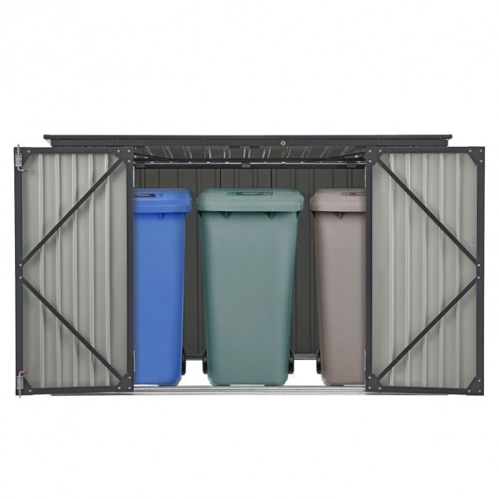 Chcete schovat popelnice a přitom zachovat čistý a elegantní vzhled před domem? Úložný box Namur nabízí dostatek místa až pro tři odpadní nádoby a zároveň je chrání před počasím i zvědavými pohledy. Díky výklopné střeše s plynovou vzpěrou se víko otevírá snadno a zůstává bezpečně otevřené. Dvoukřídlé dveře z čela umožňují pohodlnou manipulaci s nádobami.