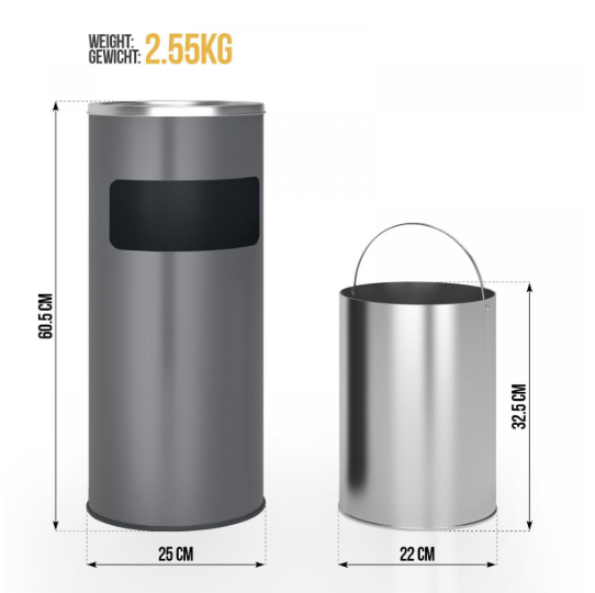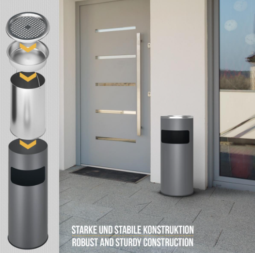 Pojďme společně udělat něco pro budoucnost a pro budoucí generace. Umístěte popelníky s odpadkovými koši tam, kde mají být používány. Ochrana životního prostředí je už několik let tématem, o kterém slyšel nebo četl každý. I malé věci, jako je likvidace odpadu, by mohly výrazně zachránit naši planetu. Abychom vytvořili čisté prostředí, rádi bychom vám představili náš stojanový popelník. Lze jej použít jak venku, tak uvnitř. Díky gumovému kroužku na spodní straně je také protiskluzový. Vnitřní kbelík koše má kapacitu 17 litrů, zatímco horní koš má kapacitu 1,35 litru. Vnitřní přihrádka koše se snadno vytahuje a čistí díky rukojeti. Horní kryt lze také sejmout.