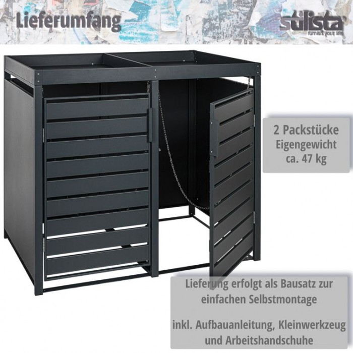 Skříň STILISTA pro odpadové nádoby nabízí prostor pro dva odpadkové koše o objemu až 240 litrů. Díky přihrádkám na rostliny na střeše boxu na odpadky si jej můžete zkrášlit podle svých představ. Odtokové otvory na střeše pro rostliny umožňují lepší odtok vody, takže květinám a bylinkám nehrozí podmáčení. Užitečné větrací štěrbiny umožňují cirkulaci vzduchu a zabraňují vzniku nepříjemných pachů v krytu. Skříň na odpadové nádoby je k dispozici pro jeden, dva, tři nebo čtyři odpadkové koše.