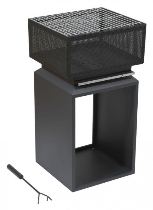 Přenosné ohniště na dřevo CUBE, s čtvercovou konstrukcí a úložným prostorem na dříví, vhodné na terasy a zahrady. Konstrukce ohniště je vyrobena z kvalitní oceli s vysokoteplotním černým nátěrem. Perforované boky ohniště zajišťují zajímavý pohled na hořící oheň. Pod ohništěm je umístěn vysouvací popelník, pro snadné čištění. Součástí balení je i pohrabáč, který lze využít i k nadzvednutí grilovacího roštu.
