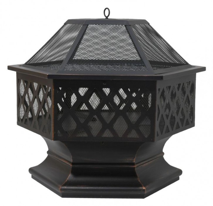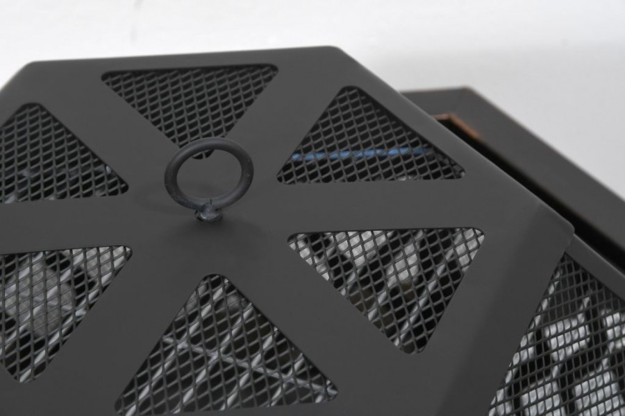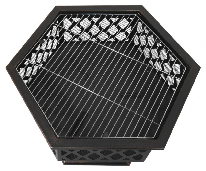 Přenosné ohniště na dřevo HEXAGON, se šestiúhelníkovou konstrukcí vhodné na terasy a zahrady. Konstrukce ohniště je vyrobena z kvalitní oceli s vysokoteplotním černým/měděným nátěrem s patinou. Pro grilování je ohniště opatřeno ocelovým roštem o rozměrech 61x53 cm. Speciálně tvarovaný poklop s pletivem poslouží jako ochrana před jiskrami, což výrazně zvyšuje bezpečnost a pohodlí. Ohniště je navíc opatřeno bytelným podstavcem, jeho umístění tak nabízí zkrášlení prostoru.