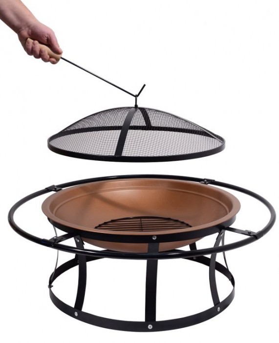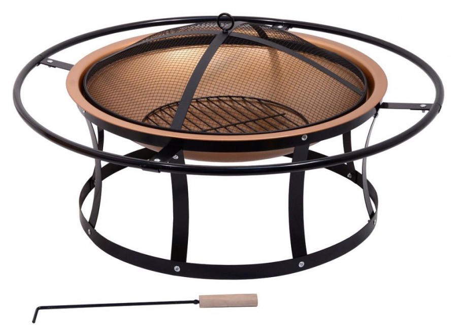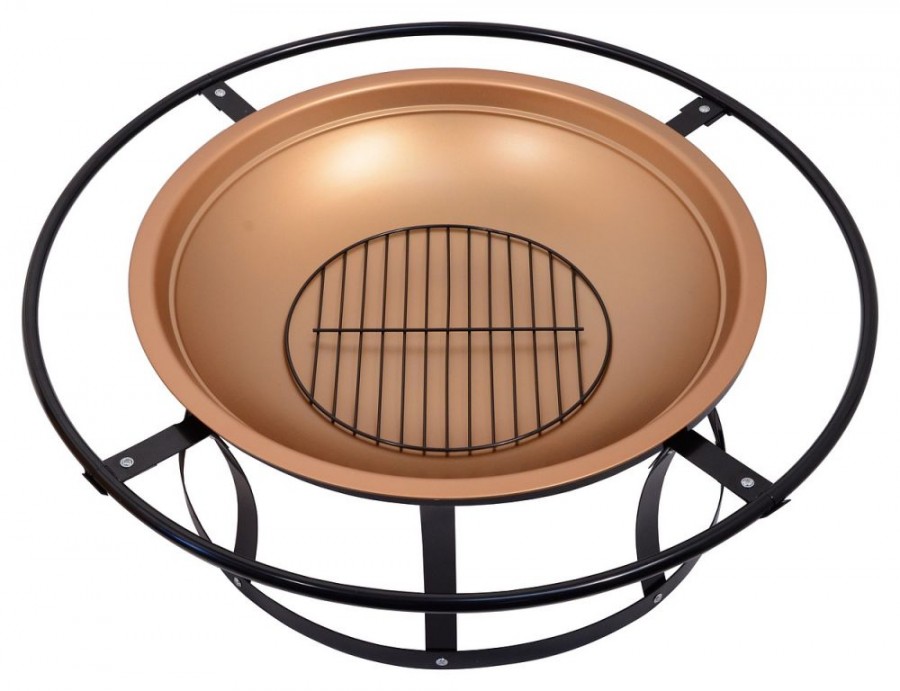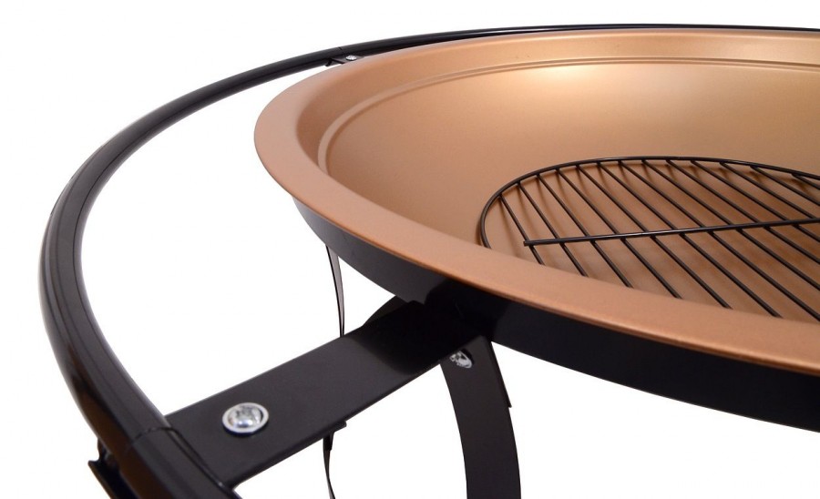 Konstrukce ohniště je vyrobena z kvalitní oceli s vysokoteplotním černým a mosazným nátěrem. Rošt je z ocelové mřížky se smaltovanou povrchovou úpravou. Speciálně tvarovaný poklop s pletivem poslouží jako ochrana před jiskrami, což výrazně zvyšuje bezpečnost a pohodlí. Přiložen je i kovový pohrabáč s dřevěnou rukojetí, který lze použít jak k urovnání ohně, tak i k snadnému sundání poklopu. Ohniště je vybaveno okrajovým prstencem, který poslouží jako madlo pro přenášení. Pro zajištění ještě větší stability jsou nohy ohniště navzájem propojeny.