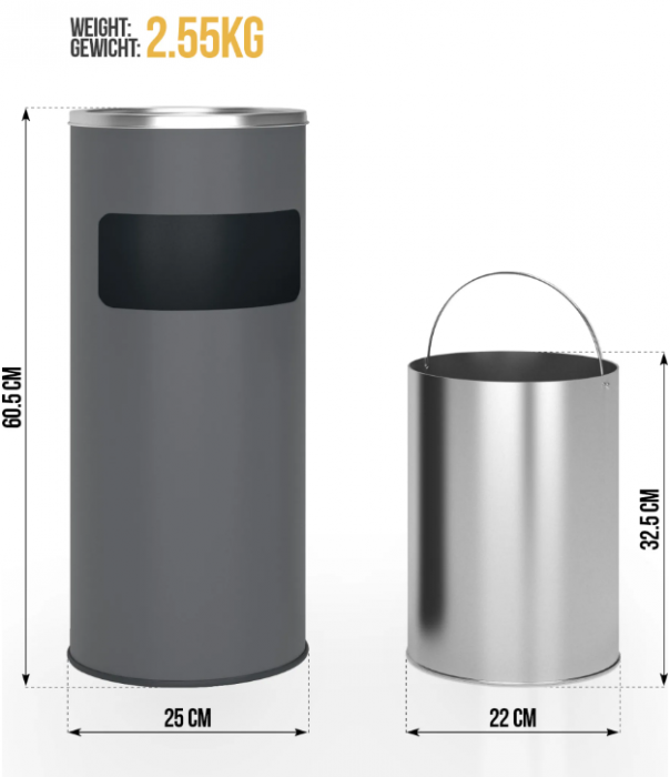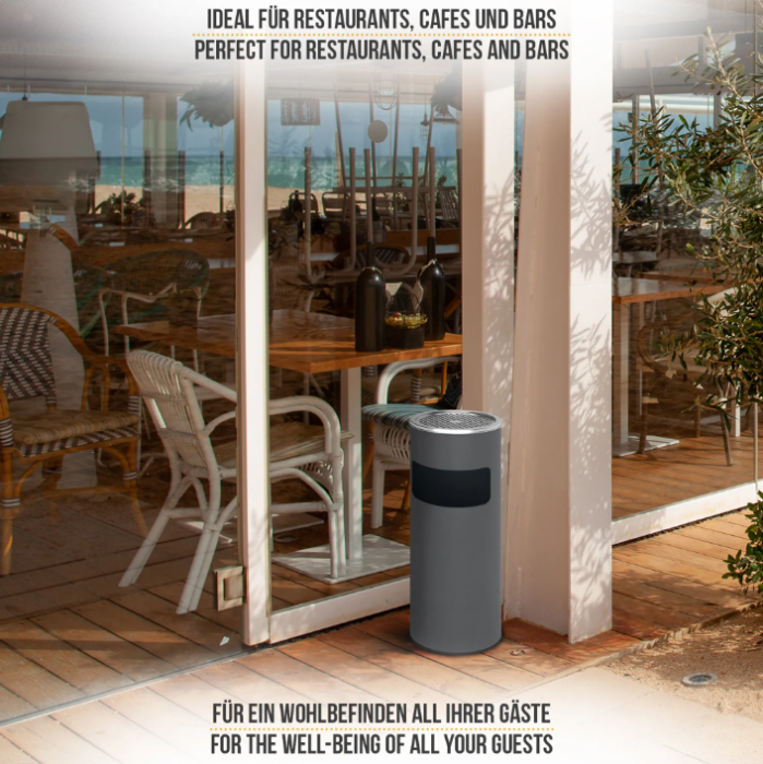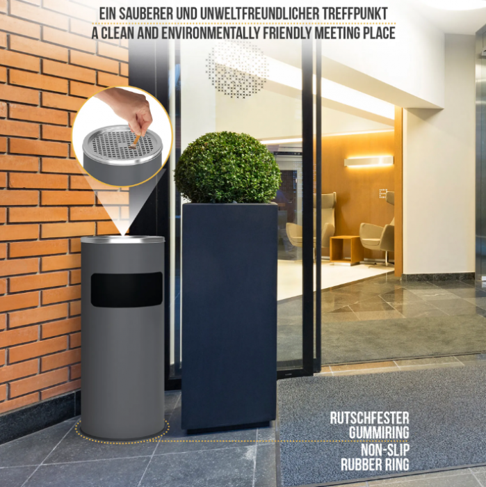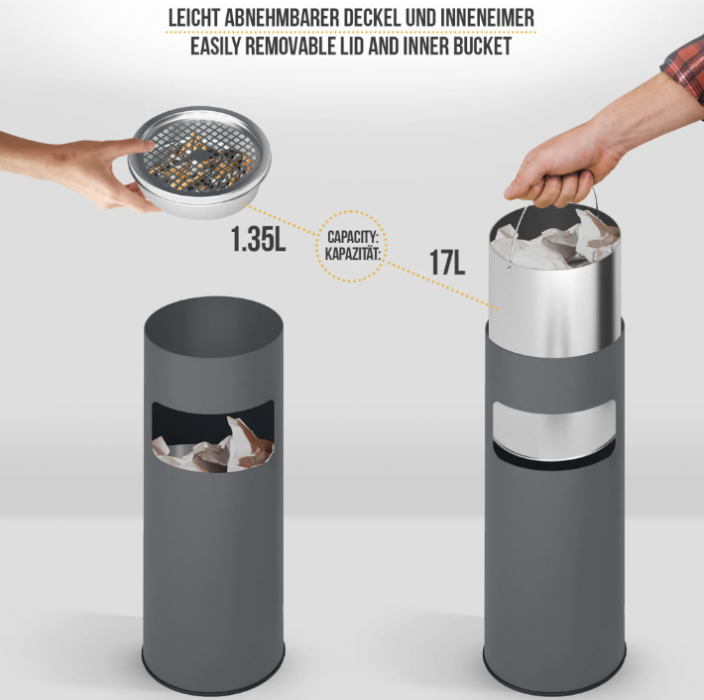 Pojďme společně udělat něco pro budoucnost a pro budoucí generace. Umístěte popelníky s odpadkovými koši tam, kde mají být používány. Ochrana životního prostředí je už několik let tématem, o kterém slyšel nebo četl každý. I malé věci, jako je likvidace odpadu, by mohly výrazně zachránit naši planetu. Abychom vytvořili čisté prostředí, rádi bychom vám představili náš stojanový popelník. Lze jej použít jak venku, tak uvnitř. Díky gumovému kroužku na spodní straně je také protiskluzový. Vnitřní kbelík koše má kapacitu 17 litrů, zatímco horní koš má kapacitu 1,35 litru. Vnitřní přihrádka koše se snadno vytahuje a čistí díky rukojeti. Horní kryt lze také sejmout.