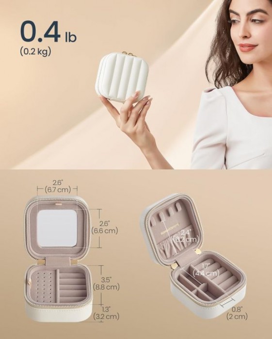 Cestujte stylově a s pořádkem. Kompaktní šperkovnice s jemným prošíváním a lesklým kováním se stane vaším ideálním společníkem na cesty i pro každodenní použití. Díky elegantnímu provedení a integrovanému zrcátku si své oblíbené doplňky uspořádáte s elegancí i přehledem.