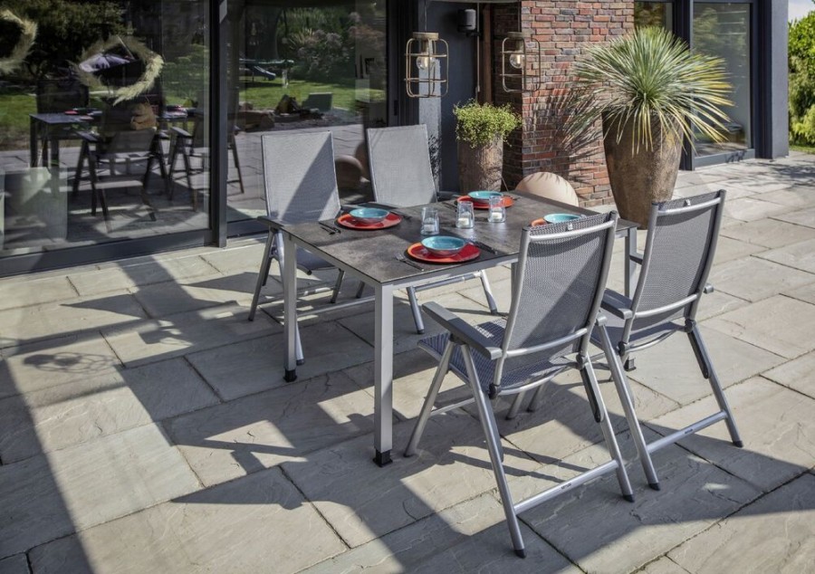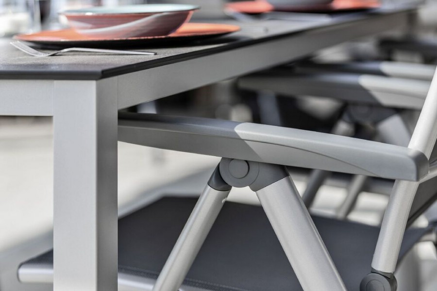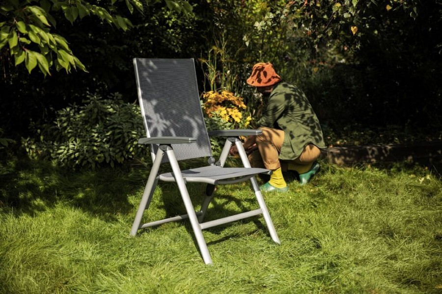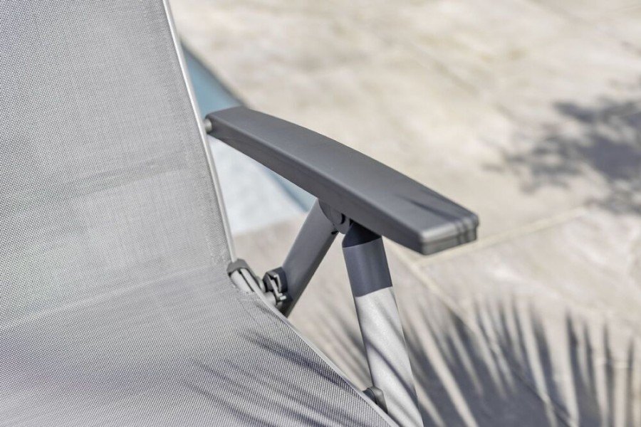 Robustní hliníkový rám s práškovým nástřikem zajišťuje vysokou stabilitu a odolnost vůči korozi. Venkovní tkanina je tvarově stálá a odolná UV záření, takže křeslo vydrží i náročné podmínky. Ergonomické područky a nosnost 150 kg zaručují komfort i dlouhou životnost. Údržba je snadná, konstrukce lehká a skladná.