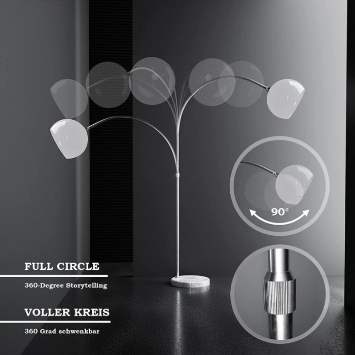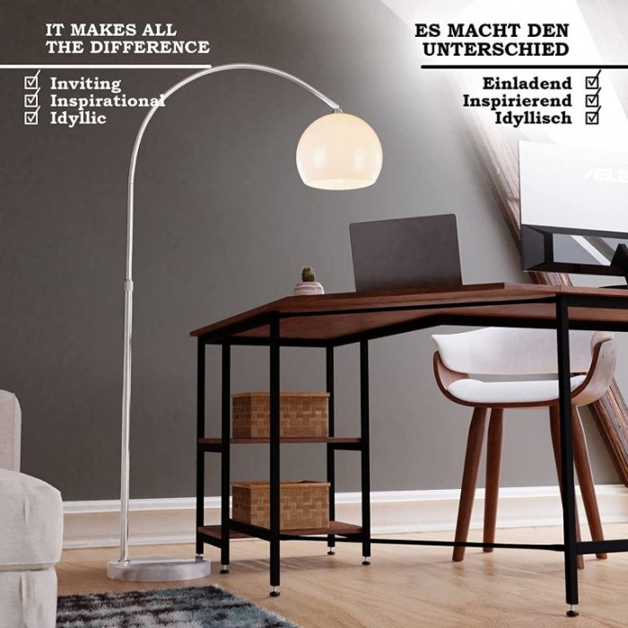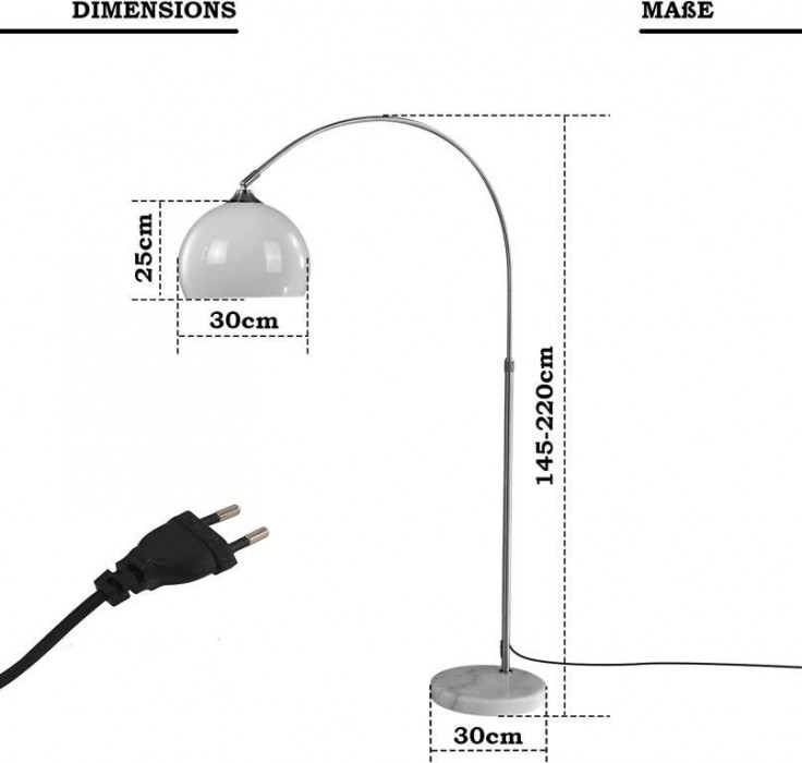 Tato bílá oblouková lampa s mramorovým podstavcem dodá vašemu obývacímu pokoji, ložnici nebo kanceláři nádech jednoduchosti a elegance. Tato stojací lampa je výškově nastavitelná (145 - 220 cm) a vyžaduje standardní žárovku nebo LED žárovku E27 max. 60 W/8W. Stínidlo naší stojací lampy lze otáčet, takže můžete osvětlit libovolnou oblast. Způsob, jakým je žárovka zapouzdřena do miskovitého stínidla, dodává obloukové lampě obzvlášť příjemný, teplý a uklidňující účinek. Moderní oblouková světla v retro stylu jsou již nějakou dobu trendem, který lze často nalézt v domácnostech a komerčních zařízeních. Tato vintage stojací lampa je velmi univerzální a může výrazně vylepšit interiér vašeho obývacího pokoje, ložnice a kanceláře. Může být také součástí kýženého retro prostředí osvětlení konceptu baru, restaurace nebo kavárny.