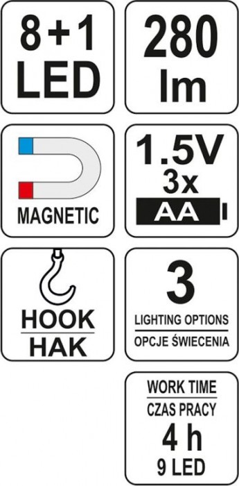 Světelný tok dosahuje hodnoty 280 lm. Lampa je vybavena silnými magnety ze zadní strany a výsuvným háčkem. Lampa tak může stát na rovné podložce, nebo ji lze díky uvedeným prvkům přichytit na kovovou konstrukci, či zavěsit na háček.
