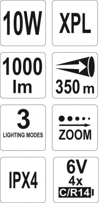 Celokovová LED svítilna, s vysokým světelným výkonem a funkcí zoom. Funkce Zoom slouží pro usměrnění toku světla do kuželu, nebo do dálky. Díky použitému LED osvětlení vyniká velmi nízkou spotřebou energie. Zapínání a přepínání režimů svícení klasickým tlačítkem na zadní části svítilny.
