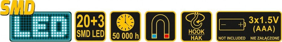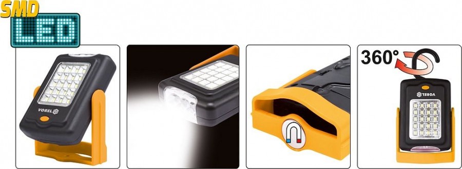 Přenosná svítilna osazená vysoce svítivými SMD LED diodami s nízkou spotřebou. Poskytuje dva režimy světla - stálé bílé rozptylové světlo a stálé bílé bodové světlo. Svítilnu lze snadno upevnit vestavěným magnetem ve výklopném držáku, nebo zavěsit na zabudovaný výklopný háček.
