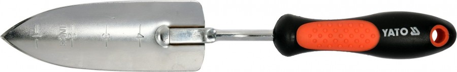 Lopatka s čepelí z odolné, korozivzdorné chromové oceli o rozměrech 5 x 15 cm s měrkami hloubky.