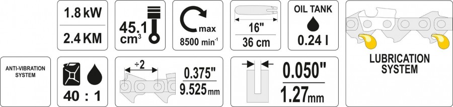 Pila je opatřena systémy pro zvýšenou míru bezpečnosti i pohodlí. Rukojeť je ergonomicky uzpůsobena proti působení vibrací. Motor je opatřen systémem odvětrání spalin a vyznačuje se snadným startem. Nádrž je opatřena průhledným krytem.