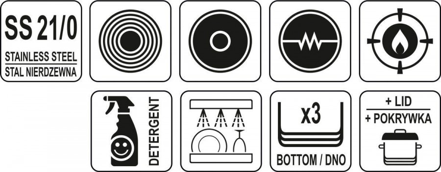 Největší výhodou hrnců z tohoto typu oceli je vedení tepla o 30% větší než u standardních hrnců vyrobené z oceli 304. Vyznačují se také zvýšenou odolností vůči mechanickému poškození a působením organických kyselin a detergentů. Proto jsou hrnce bezpečné do myčky nádobí a odolné proti intenzivnímu mytí. Hrnce YATO používají mimořádně pevné a neohřívací, pevně upevněné rukojeti. To zaručuje bezpečnost a mnoho let používání. Speciální konstrukce dna hrnce distribuuje teplo rovnoměrně po celé spodní ploše, což zvyšuje stupeň využití tepla a účinnost vaření. To se promítá přímo do jejich kvality a pohodlí práce šéfkuchaře a snižuje riziko připálení jídla. Důležité je, že hrnce vyrobené z oceli 21/0 neobsahují mangan a nikl škodlivé pro lidské zdraví. Feromagnetická vložka ve spodní části umožňuje použití hrnců YATO na jakémkoli typu sporáku (elektrický, indukční, plynový, sklokeramický).